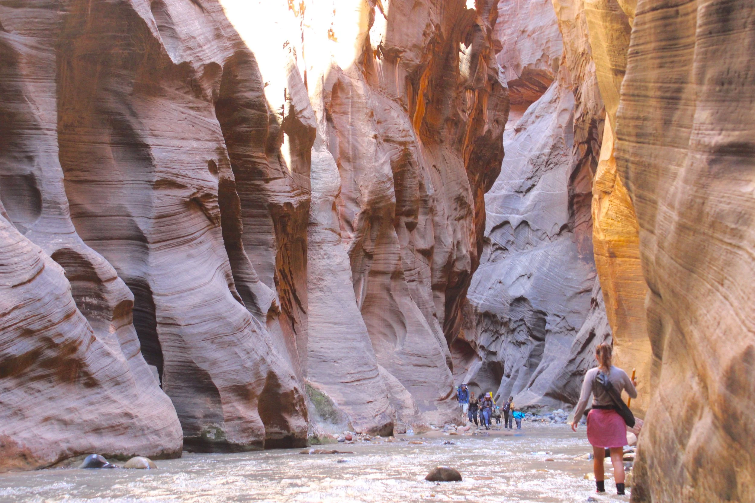 The further you go into the Narrows the cooler it gets. The sun becomes none existent as the walls grow more narrow. If you brought a walking stick feel around as you choose your footing, there are several deep drops off in different spots.